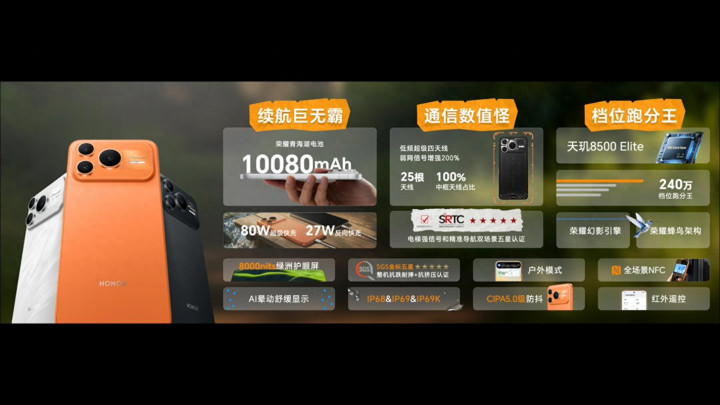 至于这次全新升级的金属中框,则是融入了全新的弱网天线技术。其它硬件升级之处,还有破一万毫安时的吓人电池,以及80W快充、满级防水、高亮直屏等实用配置升级。